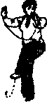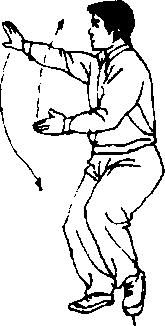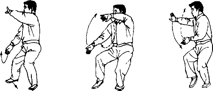 此势动作有如执着长枪舞动一样,两臂为合劲,只是左掌 如执枪柄一样向左上领起,右掌在右向左上横托,如执枪杆一 样,将右腿带起,这时腰的左侧皮肤紧,而右侧松,这是一个 运用腰部使人感到舒适的特殊动作。