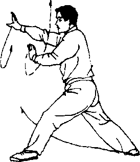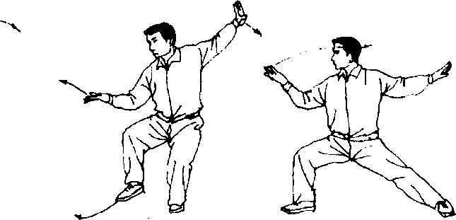 ② 此势最容易表现出顺逆大缠丝劲。它在立身中正安舒、 支撑八面的要求下,所有动作都须相对地表现出太极大缠丝 劲:两手此上彼下,此下彼上,此里彼外,此外彼里,此顺彼 逆,此逆彼顺,开中寓合,合中寓开地转动着。所以,它可以 作为太极大缠丝劲的一个典型例子。