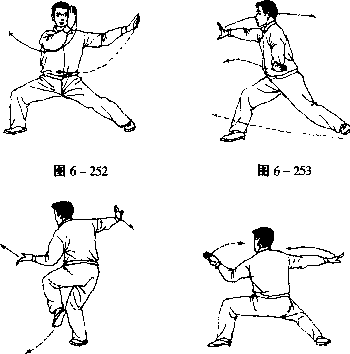 2. 左势分鬃 身体左转;同时,右掌屈肘转臂顺缠至 面前,左掌转臂微屈肘逆缠向左下按;重心仍在右腿。以右脚 跟为轴,脚尖外撇,身体右转。同时,右掌转臂顺缠向右上 翻、外展,掌心朝前下;左掌随转体向前划弧。身体继续右 转,右脚尖继续外撇,重心全部移于右腰,左脚向前提起。同 时,右掌随转体之势以逆缠向右后方(东)弧形横展;左掌微 下落,转臂屈肘向前上托。左脚向前迈步,随着重心前移,弓 左腿,左腿变实。同时,左手顺缠随重心前移之势前托;右手 逆缠向后外撑,高与肩平,掌心斜朝后下,完成第二个野马分 鬃。(图 6-252^255)