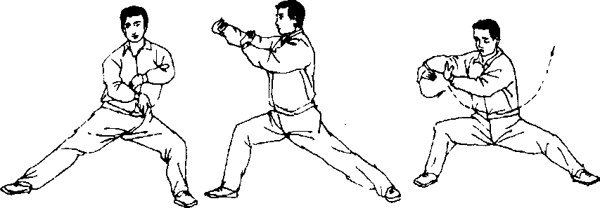② 此势较难做,对于自幼就学习的人,还是容易做到的。 为了适合年老体弱等不同的对象,适合在水泥地上或穿西装裤 进行练习,此势也可改为“摆脚下势”,就是在摆脚之后,将 后阶段中的一跌取消,改为右腿屈膝下蹲、左腿向前仆出的仆 步,接做后面的动作。