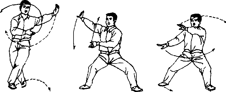 1. 摆腿拍脚 身体右转,重心左移,左膝弓出;同时 两掌相系着以右逆、左顺缠地向右平移至身体右侧,高与肩 平,掌心皆朝右。重心全部移于左腿,身体起立,右脚提起,