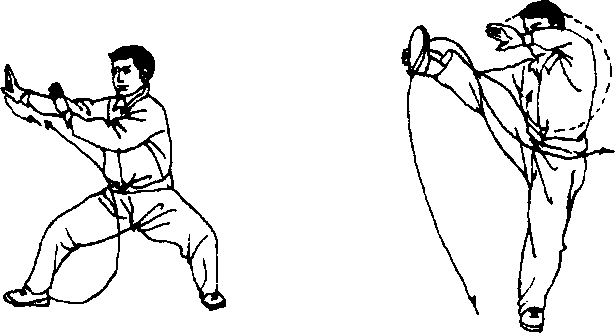 ① 此势分为摆脚和跌叉两个阶段;在摆脚阶段,摆脚时看 来好象是两手去拍脚,其实须要手和脚相互迎击,右脚外摆下 落时身体仍须中正,震脚时必须下沉劲整;在跌叉阶段,就其 技击作用来说,是预防不慎跌倒,可以利用臀部下沉着地弹 起,即以后脚撑起和左拳上冲(两者必须同时、一致地动作), ?284.