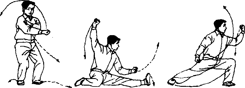 2. 跌叉起身 两掌拍脚面后变拳,左手里逆缠自左而 下经胸前向右划弧,右手外顺缠下落于腹前,两臂合劲交叉于 胸前,左拳置于右臂上;右脚横摆后,自右下落,于左脚旁蹬 地震脚,全身气向下沉,左脚跟微提起。右腿屈膝下蹲,左脚 脚尖翘起,以脚跟贴地向左铲出,左膝里扣、松胯、合裆下 沉,臀部、右膝里侧和左腿后侧一齐贴地。同时,右拳经面前 而上向右弧形举起,拳心斜朝右上;左拳经右臂里侧而下随左 脚铲出前伸,拳心朝右。身体向前而起,蹬右腿,弓左腿,成 左弓步。同时,左拳以拳面向前上方冲起,拳心朝里;右拳转 臂顺缠下落于右胯旁。(图6-301~303)