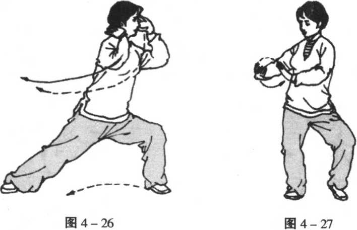 ① 身体左、右转动带动两手上、下翻转缠一小圈,和右勾 弧形上提要分别体现出缠丝抽丝的内劲。定势动作要松肩坠 肘、沉腕、松腰沉胯、敛臀、气下沉。