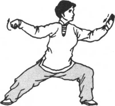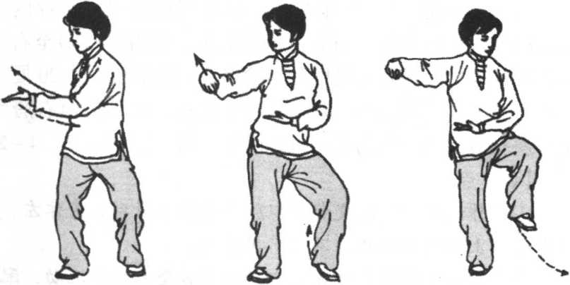 1 .虚步缠提 身体微右转,左手内旋向右前方微推后,