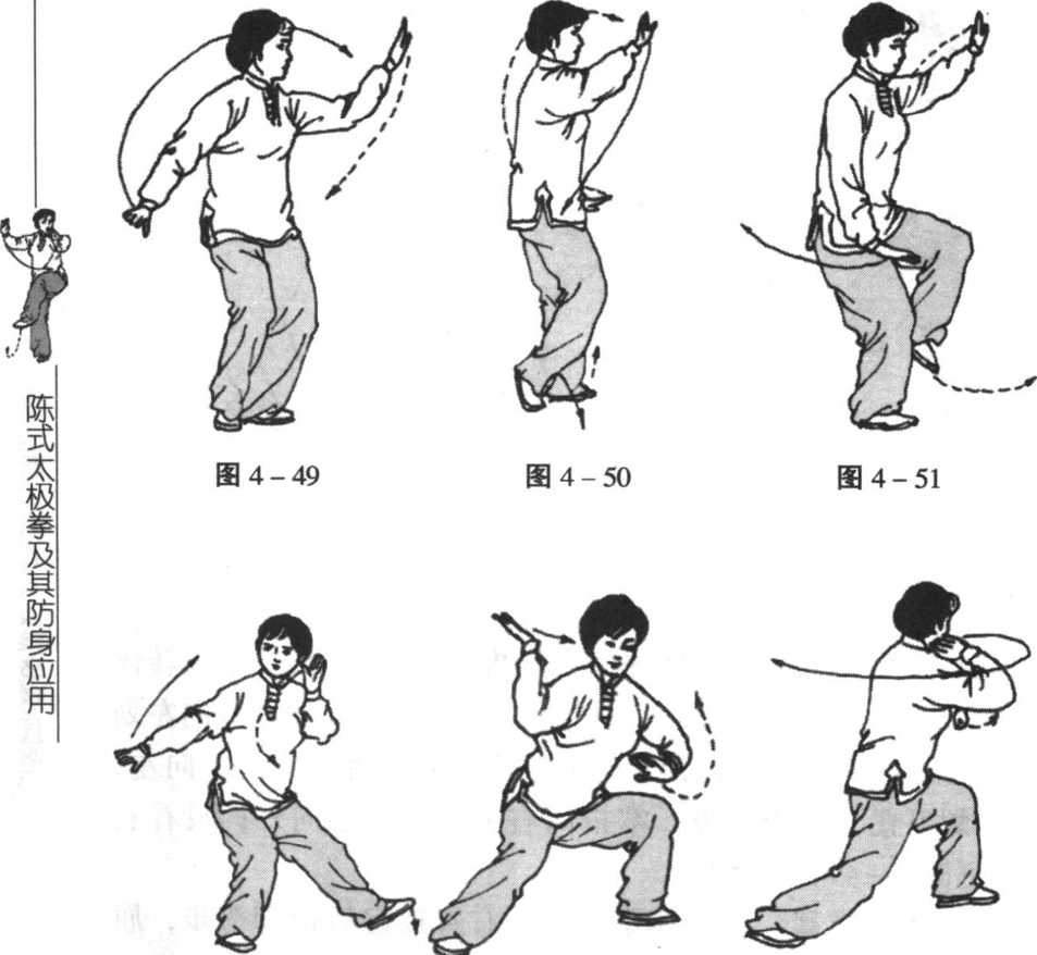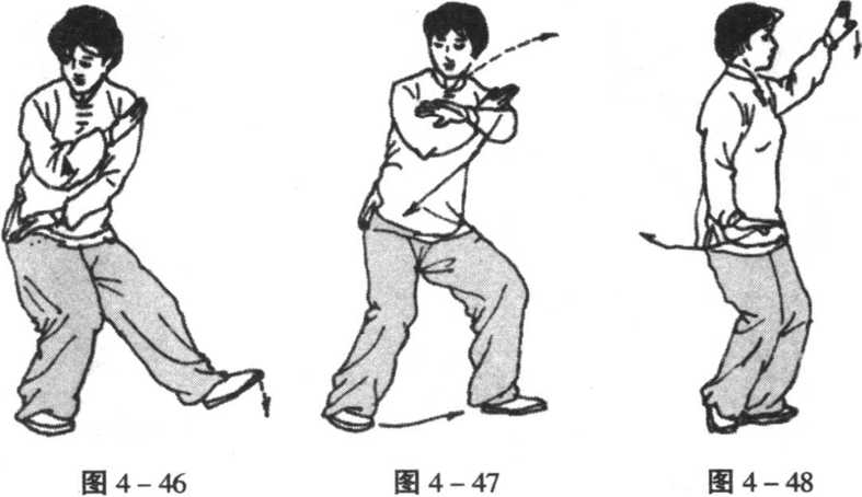 1 .旋腰绕臂 上体先微右转再左转(胸向东);随转体 右脚尖点地碾转;同时,左手外旋向右、向下,微内旋向左划 弧置于左胯旁,掌指向前,掌心向下;右手外旋向上、向左、 向前划弧置于右前上方,掌指向右上方,掌心向外;眼看右 手。(图4-49、4-50)