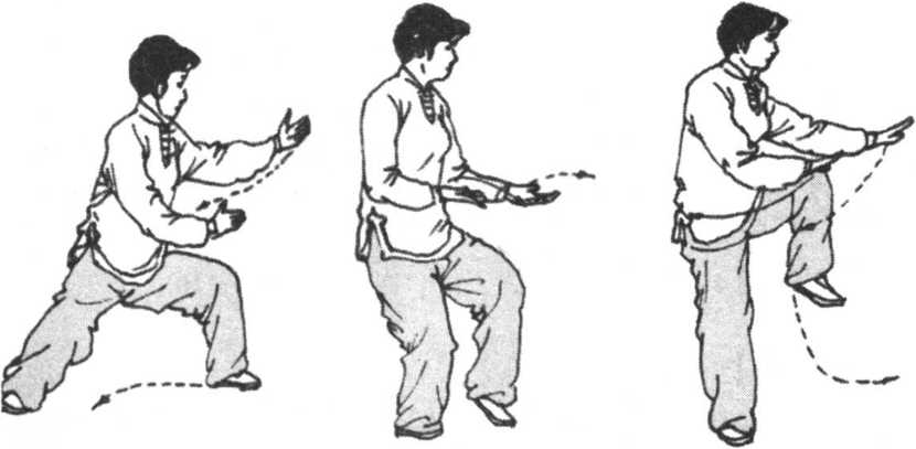 ② 提膝与两手推按时,要与上、下合劲,以达到独立稳定 的效果。