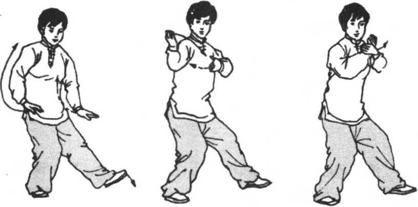 2. 转身前捆 身体微左转;重心稍移向左腿;左脚尖 落地踏实;同时两手继续向右经腹前向上划弧;左臂屈肘横于 胸前,掌心向右;右掌继续向右、向上划弧,外旋屈肘,而后 内旋,以右手腕附于左前臂内侧;眼看右手。(图4-61. 4- 62)