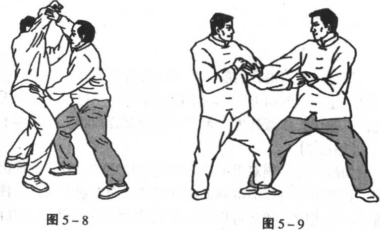 如敌从右侧进攻,提起左脚向前进步落在我右脚内侧,用 左腿挤靠我右腿,用左手按我胸部,我则接握敌左手顺缠,同 时抬起右手放至敌左肘上侧,小臂下侧压在敌左肘上侧,敌则 会抬起右手向前搠接我右手,这时我两手顺缠挤拿敌左臂,令 其不能保持进攻之势。(图5-9)