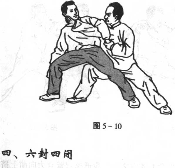 接上势,若敌向后退去,我则顺势左手拿敌左手,右手从 敌左腋下走横拗劲。敌稍退时走右肘劲,再远走右小臂、右手 之右拗劲,体现三节劲,节节贯串,节节打人。同时我右膝里 扣,以下扣上翻之势,走摔法。如我右手仍以敌臂外缘走劲, 则用左手反拿敌左手,右臂肘横扔敌左臂反关节,或以右掌击 打其面部、胸部、肋部。(图5-10)