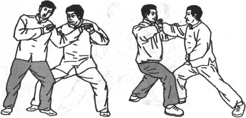 如敌从我右侧双手抓我右臂施推按之劲,欲将我推出或推 倒。我即乘势右臂下沉划弧随身左转,向左前下引进,使来力 落空。引进时,我还可以以右手反拿敌右腕,使之上身前倾, 这时我可乘势追击,获得优势。(图5-12)
