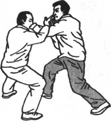 接上势,当我左手接近敌胸部或下须时,乘敌失势调整重 心含胸后坐时,我左手逆缠旋转托住敌下须向左上托起,敌下 须被托身后仰,我同时以左膝上提撞击敌裆内或腹部。(图5 -111)