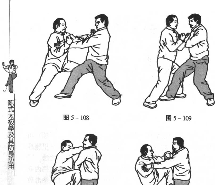 敌上步出右拳击向我胸部。我则迅速左手上提,向下、向 左搂化。同时右腿屈膝上提,向前顶击敌裆部;右手立掌向 前、向上穿掌击敌喉部。(图5 - 112、5-113)