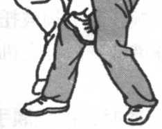 此动作另一种用法,即当我左拳上冲时,被敌顺手抓拿, 我左手顺势上引,右手向右侧下采拗敌之左手,敌中盘空虚, 我迅速提膝击其裆部。