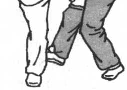设敌从我身右外侧进步双手按推我右肩肘欲将我推出跌 倒。我即乘势身向左转下沉,重心移左,同时右腿逆缠以脚跟 里侧向右侧蹬击敌前腿。同时我双手臂先向右搠,左顺右逆缠 变左逆右顺缠,再向左外上撮,使敌双手臂按劲落空失势。 (图5-107)