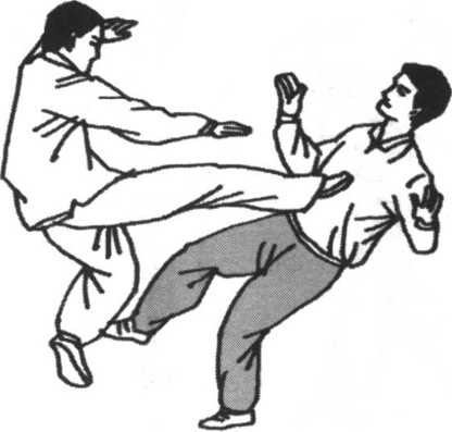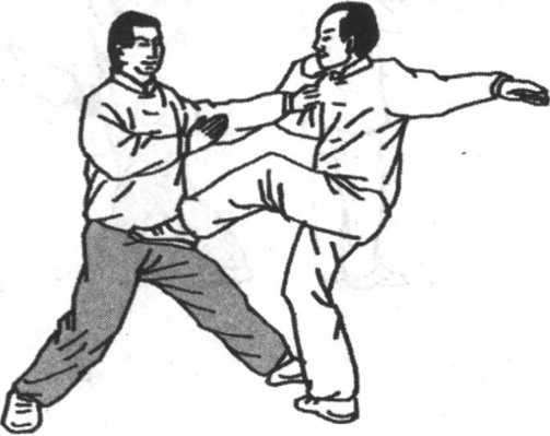 图 5-132图 5-132若见敌撤步坐腰准备进攻,我即乘势变重心为右前,左手 再向前下变左后(即敌人的前下)引化和采击,乘敌前倾之 际,我左脚乘机向敌裆、胸等部踢去,敌如坐腰欲避开,我右 腿即乘势蹬地腾空跃起,向敌胸部或下须踢去。这个动作还有 以下含义。①左右手上扬,既可击打敌面部,也可以为腿脚做 掩护,为惊上取下之术。②左脚先踢,也可以是虚发,引化敌 注意我左脚,实则我已迅速起右脚点击其胸部、肋部。(图5 -132. 5-133)