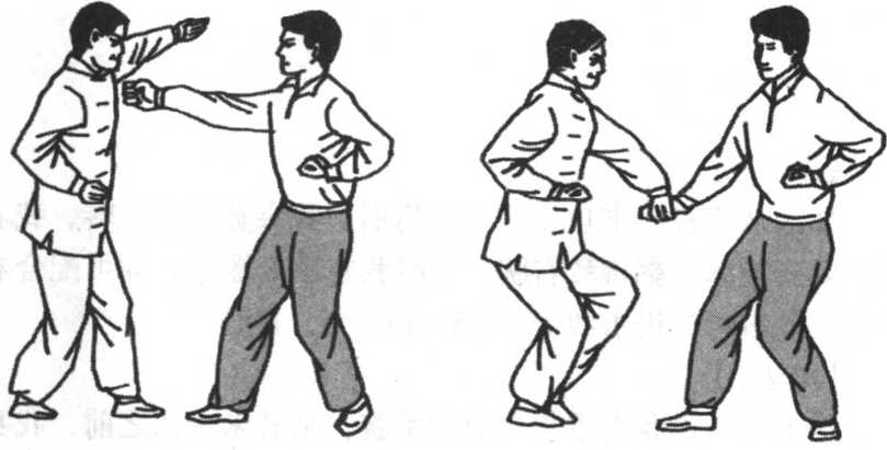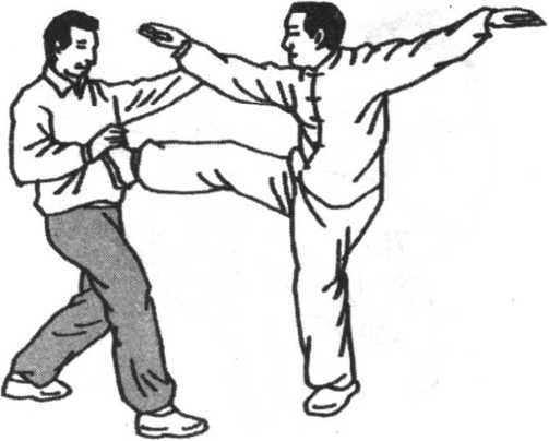 此势名字系由技击的术语而来,即左右脚分别跳跃一次, 并以右手拍击右脚,在技击上有连环踢击的作用。