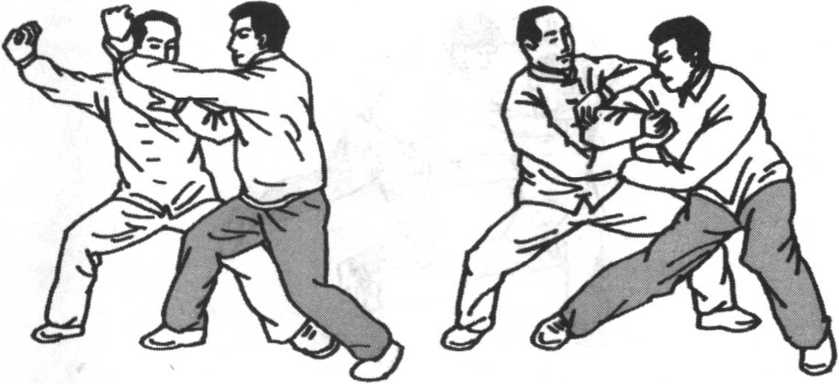 接上势另一种做法是,当我双手擒拿住敌右手肘时,敌向 下松沉,解脱我的拿劲,右拳再向我进击,此时,我向右上方 引化敌右手,使敌右胸露开,我下沉左拳,猛击其胸部、腹部 或裆部。(图5 - 160)