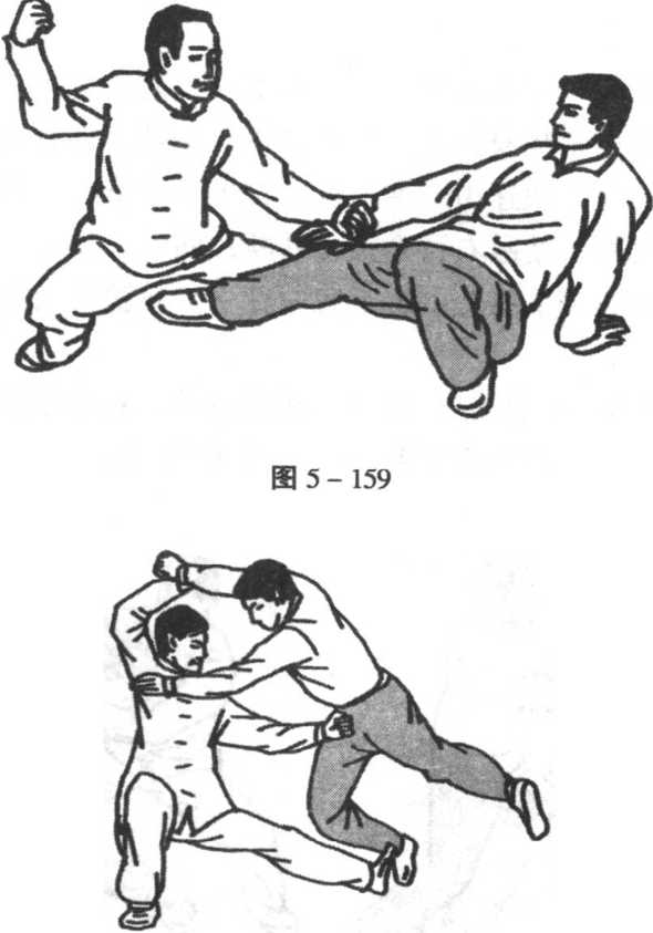 我即乘势身右转下沉,重心偏右后。左腿逆缠,脚尖里 勾。同时我双拳以左顺右逆分向左前下、右后上分物,左拳下 沉击敌右脚踢来之势,右拳再向上搠,以保持平衡,或继续引 开敌之右臂。(图5 - 159)
