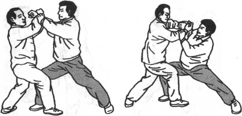 设敌从我正面进右步用双拳向我面部扑击,欲将我面部击 伤。我即乘势身快速先微左转略下沉,同时双手逆缠上搠敌双 手腕,将敌双手臂向上搠开,再快速微向右转,乘机双手腕粘 连旋转以左前右后交叉相合、坐腕,向敌胸部或面部击出。