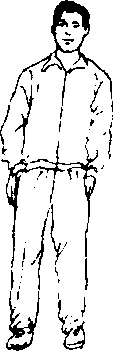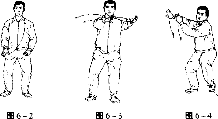 两脚左右分开站立,两脚尖分别向外撇约30度,两脚跟 齐平,相距与肩同宽,身体自然中正站立,重心落于两腿之 间,两臂自然松垂,两手轻贴大腿两侧,目平视。(图6-1)