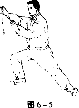 至左脚踏实;同时两掌仍以左逆、右顺缠,向右后方继续展开 并微沉,在左脚踏实的同时,两手随体转前移。重心向前移于 左腿,身体随着左转,右脚前上一步,以脚尖点地成虚步状; 同时两手自后向前左逆、右顺缠,左手手心朝下、屈肘向前挤 出,右手随着右脚上步时前撩,两手形成合劲,目平视。(图 6-5、6-6)