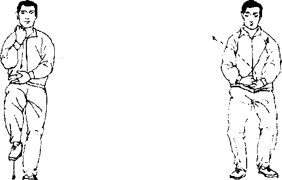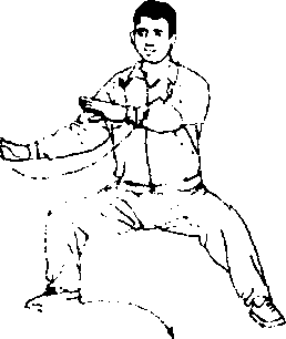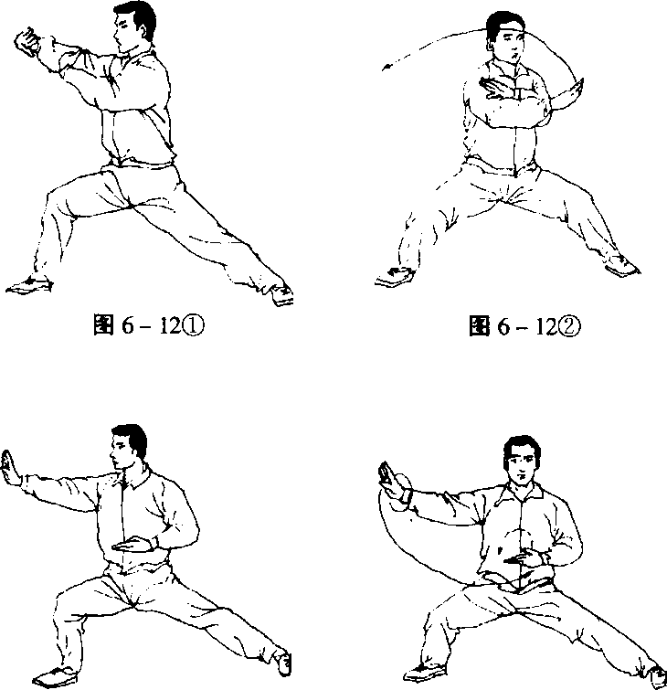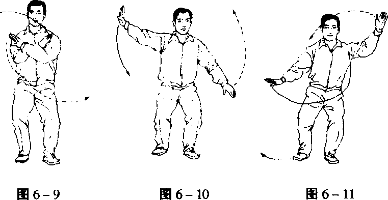 1. 擦脚合手 右腹略下沉,身先微左转,再转为微右 转,随即转正恰似用脐划了一个拳头大的小圈;同时两手在小 腹前仍为左掌右拳相粘随转体自左向外而上向右而下绕一小圈 (仍复为图6-8的姿势)。接着身体再由微左转转为微右转; 同时两手左逆、右顺缠,合劲交叉于胸前;由左腿实转为右腿 实。两手扩大缠丝圈,右上顺、左下逆缠地分开,形成开劲; 开时由右腿实变为左腿实。重心全部移于左腿,右脚提起,即 以脚跟向右贴地铲出;同时两手继续划弧,由大开转为双顺缠 大合;重心渐渐右移,右脚尖踏实,身体微左转,右手稍左 展,目视前方,顾及两掌。(图6-9?12②)