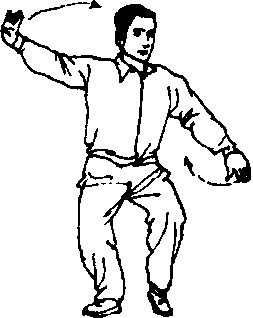 2.虚步撩挤 两手扩大缠丝圈,以左逆、右顺缠自左 而上合住劲地向右运转;左手移至右胸前,掌心朝右;右手运 转至右侧,高于头平;当两手开始向右运转时,重心右移,右 腿变实。以下同第二势“金刚捣碓”动作2的后部说明,惟方