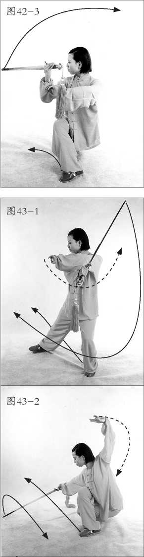 左手心向外,剑刃向上,剑尖向右后 方。目视剑尖(图42-3)。