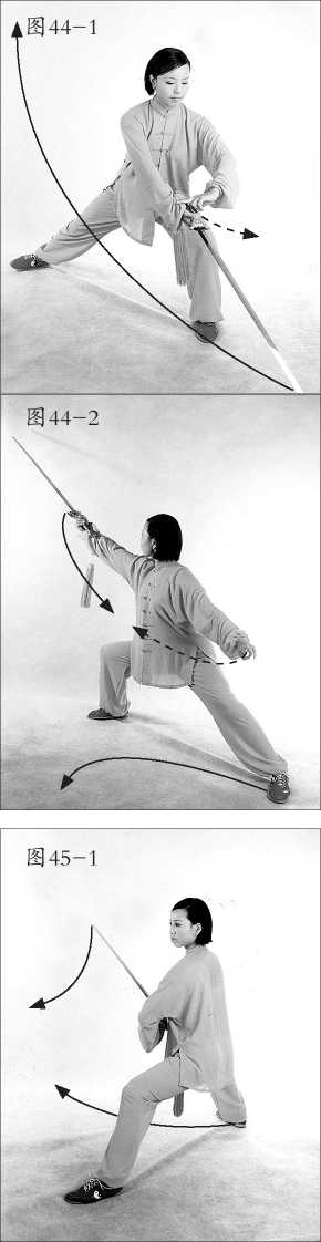 2. 歇步下扫(抹):身向右转,重 心后移右腿,左脚向右后方插步,两腿 交叉下蹲,成歇步(或坐盘)。同时右 手持剑,随体转后移,经体前分臂压剑 下扫(抹)于身体右前下方,剑尖向前 (西),手心向下、高与腰平。左手剑 指划弧上举至左上方,手心向上。目视 剑尖(图43-2)。