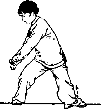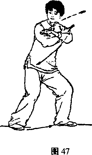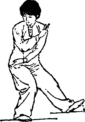 ①身体重心右移;上体右转;同时两拳内旋向右下方划 弧至右膝外侧;眼看两拳之间(图41)。