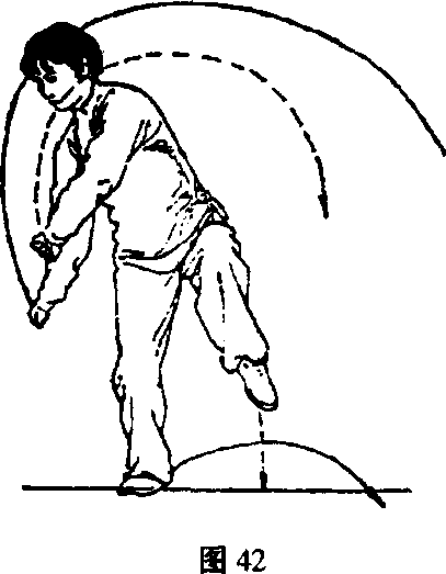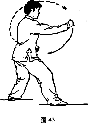 拳心斜向里;右拳外旋向上、向右前方划弧抡击至身体右前 方,拳同肩高,拳眼向上;眼看右拳(图42~图43)。