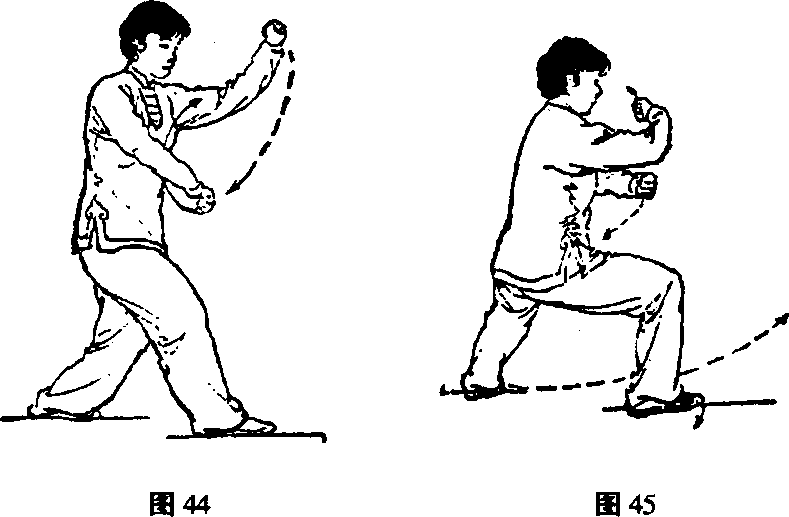 ③ 重心右移,上体右转;右臂屈肘内旋,右拳向下、向 左划弧至腹前,拳眼朝里;左拳向左、向上、向右屈臂划弧 至额前;接着,左拳向下、向右经胸前屈肘落于右肋前,拳 眼向上;右拳外旋向上,经胸前从左前臂内侧向左前方伸腕 搠出,拳同胸高;随即上体微左转(胸向东);两腿屈膝半 蹲成右偏马步;同时两拳、臂合劲;眼看右拳(图44~图 45)O