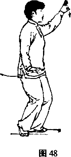 ② 左脚尖落地踏实;上体微左转;同时左手内旋向上; 右手内旋向下,经胸前时两臂相交,左手在外;接着,重心 全部移至左腿并微屈,身体继续左转〈胸向东);随之右脚 收至左踝几侧约20厘米;随转体左掌经面前,右掌经腹前 分别向上、下分展,臂微屈,左掌置于身体左前方,稍高于 头,掌心向外,指尖斜向上;右掌下落置于右胯旁,掌心向 下,指尖斜向前;眼看前方(图47?图48)。