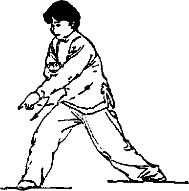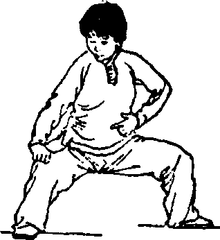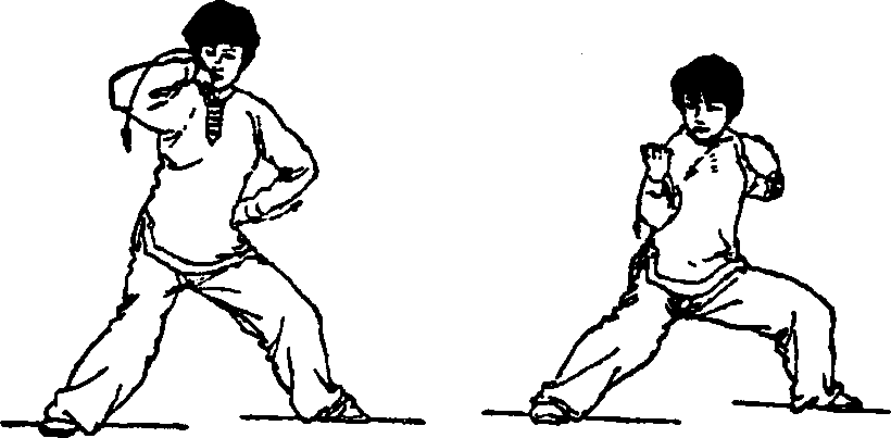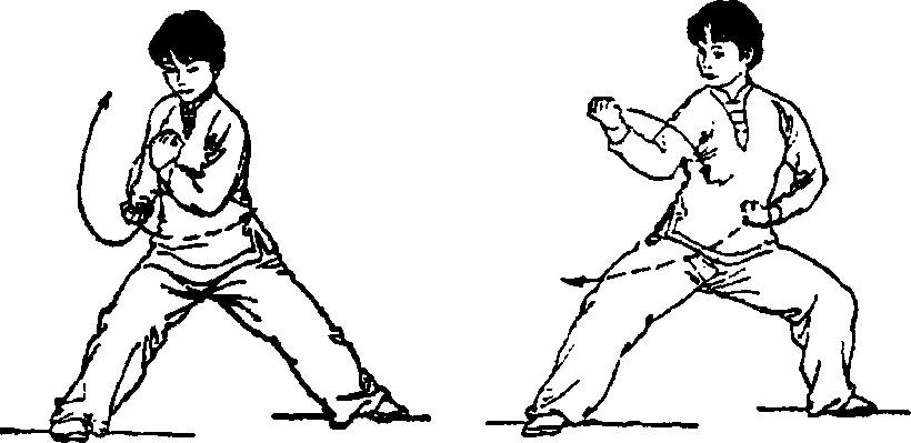 身体右前方,拳同肩高,拳心斜晌上;左拳继续向右、向 下、向左划弧置于左腹前;眼看右拳(图81)。