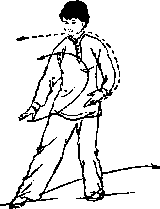 ② 重心全部移至左腿并屈膝,右脚提起向右后退一步, 身体右后转(胸向北),随着重心移至右腿并屈膝,随之左 脚以脚前掌为轴碾转并脚尖点地,左腿屈膝并稍外展;同时 两手臂继续向左、向上划弧,左手同肩高,右手同胸高时,
