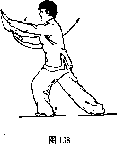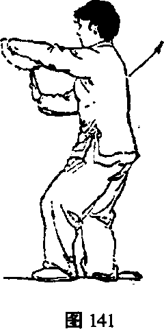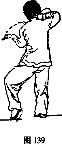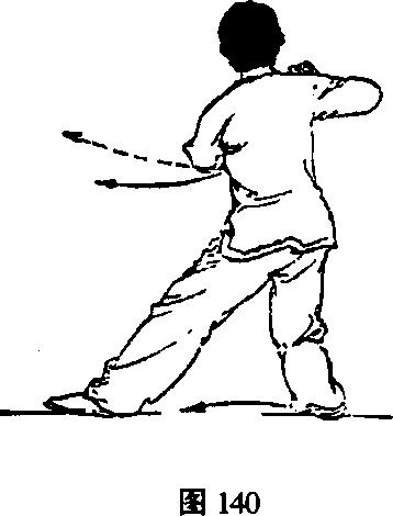 ③ 动作与第(二五)势“右连珠炮”技法③的动作相 同,唯左右对称,方向相反,文字叙述略(图140~图 141 )0