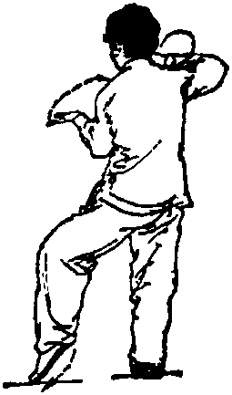 ④ 动作与第(二五)势“右连珠炮”技法④的动作相 同,唯左右对称,方向相反(图142)。