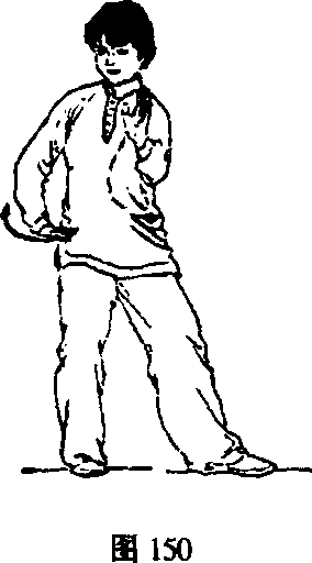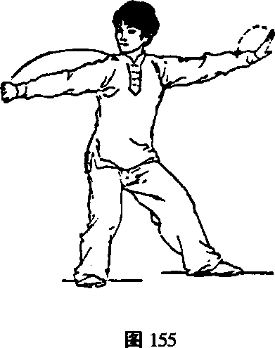 ①	身体右转;随之左手外旋稍向上、向右划弧于左胸 前,指尖朝上,掌心向外。右手随体转向下、向右划弧于右 胯旁,指尖朝左前方,掌心向下。接着身体左转,随之左手 继续向右、向下、向左划弧于左腹前,指尖朝右,掌心向 下。右手继续向右、向下划弧经身体右前下方时,外旋向 右、向上于腰侧,指尖朝右前方,掌心向上;眼看右掌(图 150 ~图 151)。