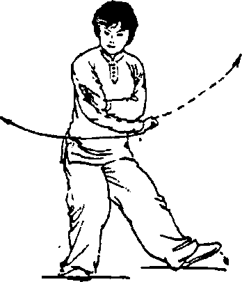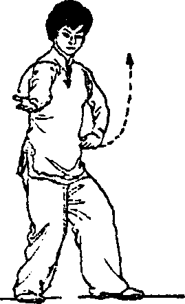 身体左右转动,带动两手臂左右划弧缠绕,要协调柔 顺;同时两手臂在胸前合劲,然后转腰发拳,转腰、收掌、 发拳要协调一致。发拳时上体稍前倾,但不可塌腰凸臀。