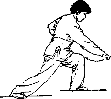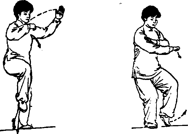 ②	身体微右转;重心全部移至左腿并微屈,右腿屈膝提 起,膝同腹高,脚尖自然下垂;同时左手继续向左、向下划 弧经身体左前下方时外旋向上、向右划弧举臂于头左前方, 指尖斜朝上,掌心向右。右手继续向上、向左划弧同肩高 时,右掌变拳屈腕向左,同肩高;接着右脚下落踏地并屈 膝,左腿屈膝,左脚跟抬起,脚尖点地;同时左手向右下划 弧,右手向左下划弧合于胸前,两臂屈肘,前臂相叠,左臂 在上,右臂在下,随即右腿屈膝下蹲,左脚提起,以脚跟内 侧擦地向左前方铲出。两手臂继续合劲,左手指尖朝右上 方,掌心向右下方。右拳拳心向下;眼看左掌(图152~图 154) o