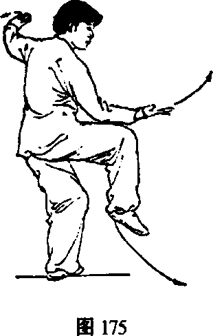 方、掌心向外。左手向右、向下,外旋向前、向左划弧于右 膝前上方,眼看右手(图175)。