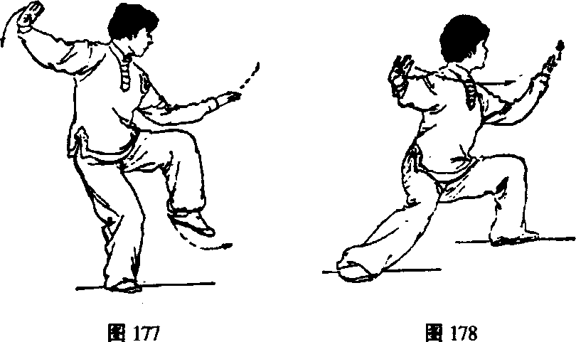 技法①要注意腰胯先左后右的小幅度移动。以使提膝绕 臂的动作圆活轻灵。