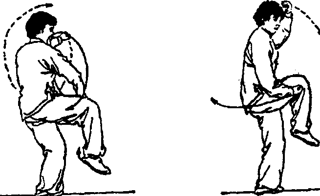 ② 重心全部移至右腿,脚蹬地,左脚随即向前上一步踏 实,右脚在左脚将落未落之时,迅速向左腿内侧收提起;上 体左转;同时左拳向下、向左后划弧上举至肩左前方,拳稍