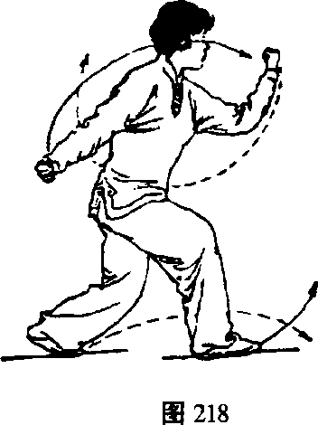 高于肩,右拳向上、向前划弧屈臂举至肩右前方,拳同肩 高;眼看右拳(图219) o