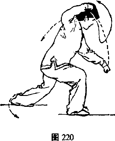 出,重心移向右腿,脚尖下落踏实,右腿屈膝成右弓步;两 手臂随身体左右转动在身体两侧,左手按顺时针方向,右手 按逆时针方向各划一圆,而后上体右转(胸向东南),随之 两臂内旋,右拳上提于头右侧,拳心向下。左拳向左前下 栽,同小腹高;眼看左拳(图220)。