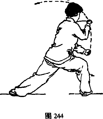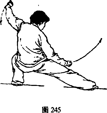 裹鞭炮中主要包含两种技法:技法①跳换步绕臂(图 240、图241);技法②左偏马步双分横抖(图242、图243)。