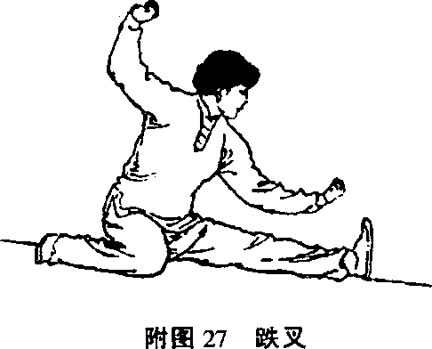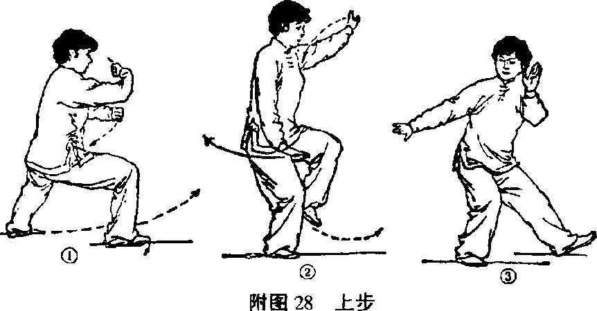 上步(附图28)是向前位移的步法之一。上步时,一 腿屈膝支撑,坐甑、敛臀使之沉稳;另一腿提起经支撑腿内 侧轻灵前伸,接近顶点时以脚跟内侧稍快铲地落步。陈式太 极拳的另外一种上步是,前脚向前上半步,脚跟先落地,继 之身体重心前移,前脚掌落地,全脚踏实。