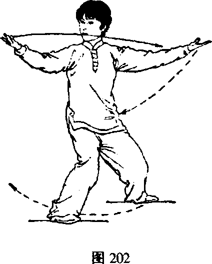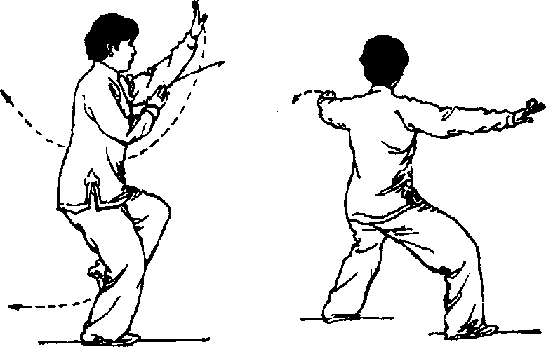 向上。随之重心移至左腿并屈膝,右脚掌轻贴地面经左脚内