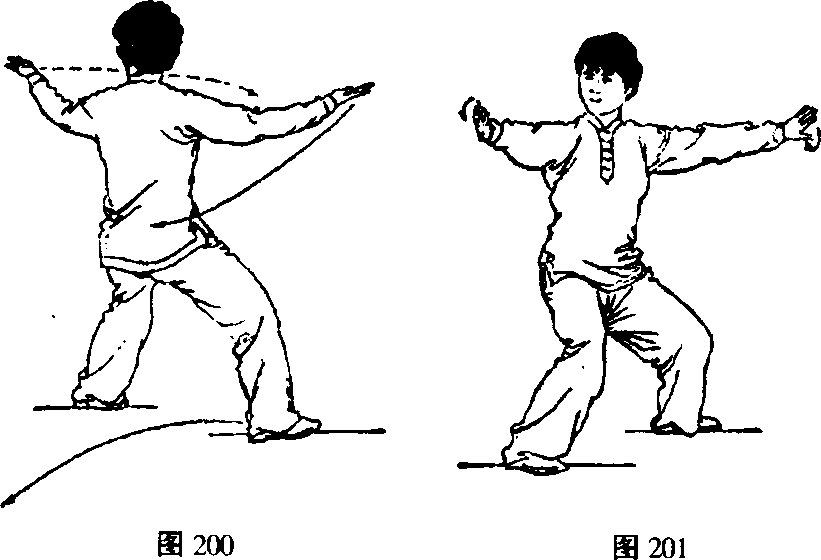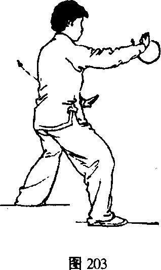 倒卷肱中主要包含两种技法:技法①落步单推掌(图 198、图199);技法②退步单推掌(图200、图201)为右退 步单推掌;(图202、图203)为左退步单推掌。